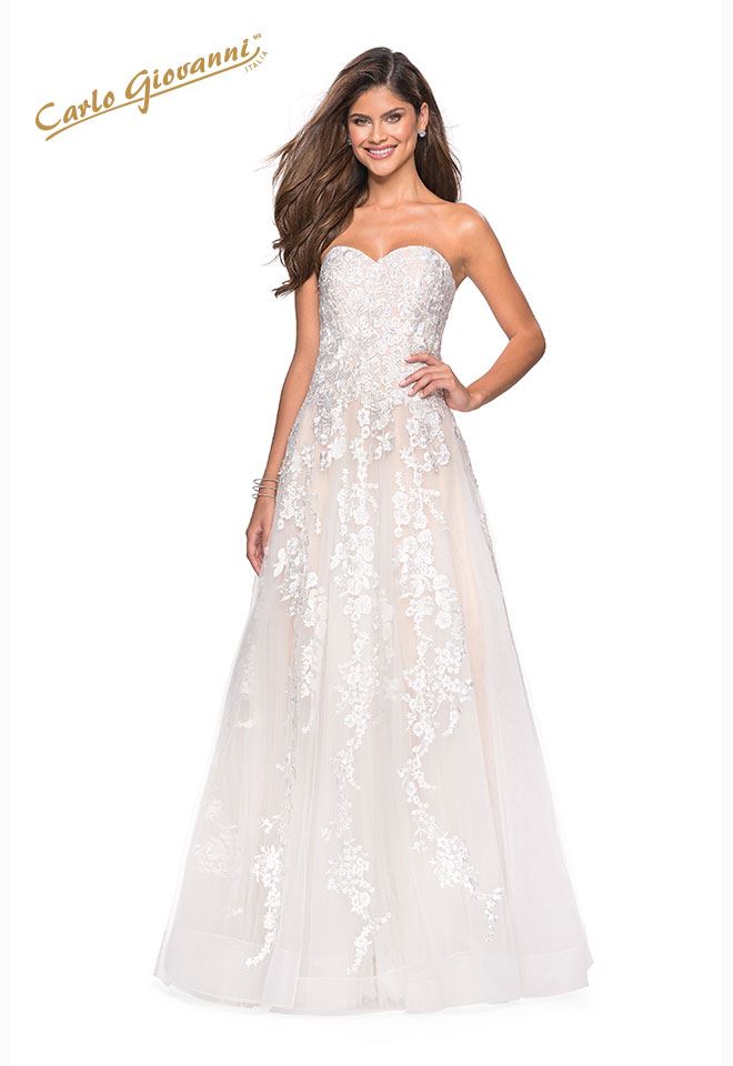 Atrévete a ser tu misma en este vestido strapless con increíbles aplicaciones florales. Se ajusta con cierre en espalda.
